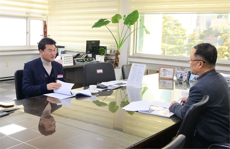 메가시티뉴스 정하룡 대표가 1월 16일 부산 해운대구청에서 김성수 해운대구청장을 만나 2023년 신년 덕담과 함께 해운대구 현안에 대한 여러 아이디어를 나누고 있다.(사진=해운대구)