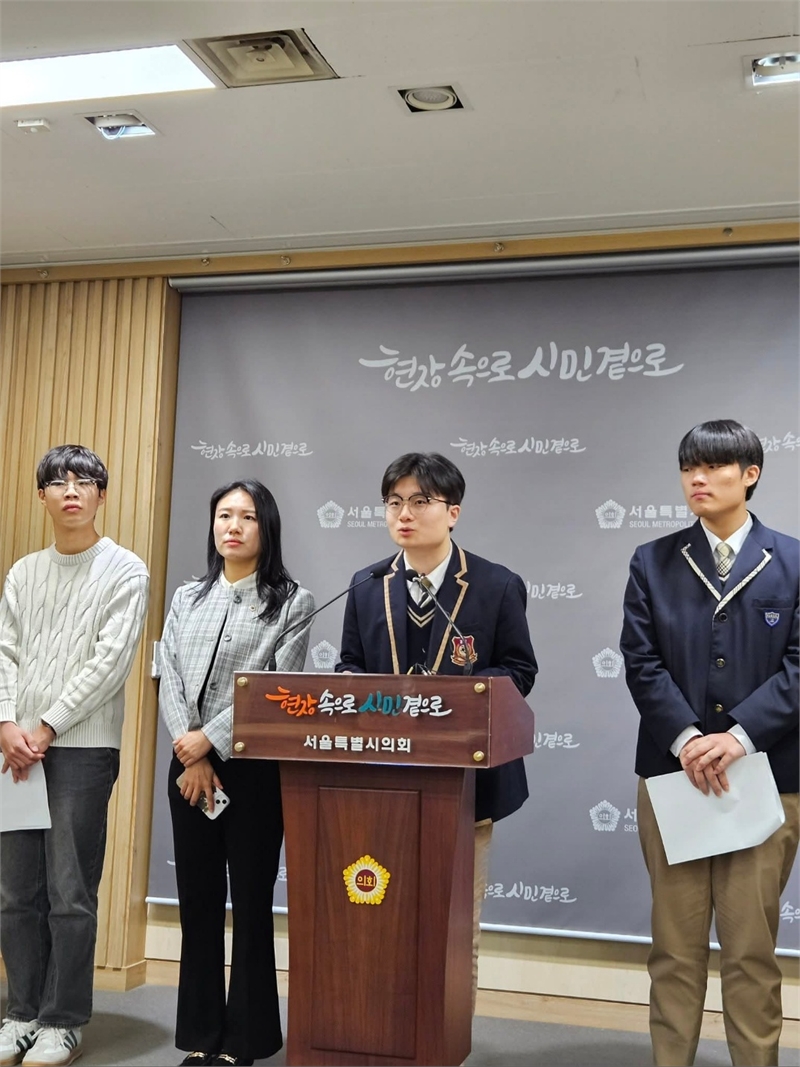 민주청소년네트워크 곽동현 대표와 소속 청소년들이 22일 서울시의회 브리핑룸에서 '심야 교습 연장 조례안' 철회를 요구하는 회견문을 낭독하고 있다.[사진=청소년네트워크 제공]