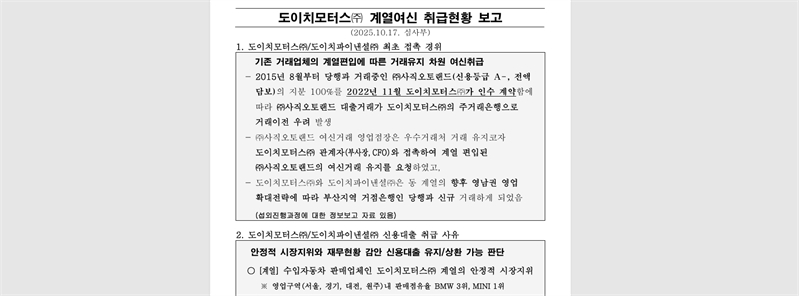 도이치모터스 계열여신 취급현황 보고(자료 제공=금감위)